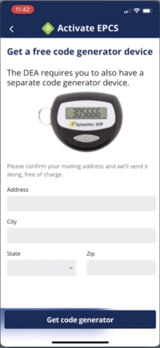 5. Next, you will enter a mailing address of your choice to receive a physical device that you can use for two factor authentication when you send controlled substance prescriptions to pharmacies. This should arrive in 5-7 business days with instructions.