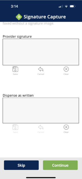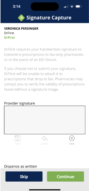 As depicted in the above image, DrFirst requires your handwritten signature to transmit e-prescriptions to fax-only pharmacies or in the event of an EDI failure. If you choose not to submit your signature, Drfirst will be unable to attach it to prescriptions that drop to fax. Pharmacies may contact you to verify the validity of prescriptions faxed without a signature.