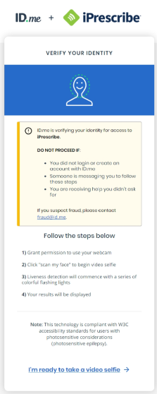 Whether you registered for iPrescribe as a single provider or you registered your practice, you will need to complete identity proofing (verification) via ID.me before you can prescribe.