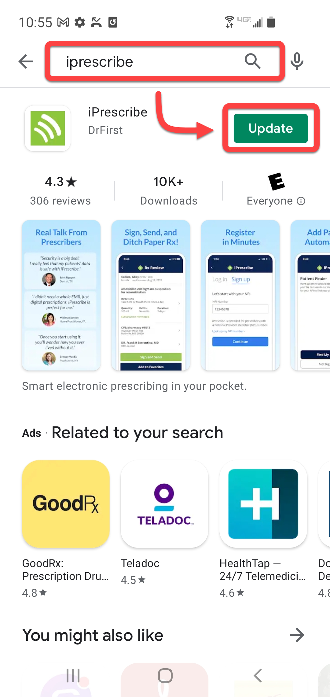 2. Search for iPrescribe in the search field at the top of your screen, then tap the Update button next to the iPrescribe app from your search results.