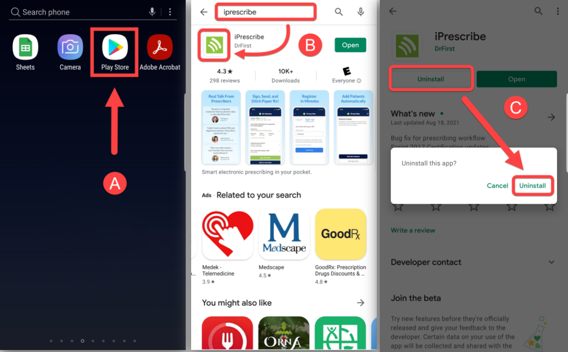 • Follow the directions outlined in the next section for step-by-step instructions on reinstalling the iPrescribe app on your android device.