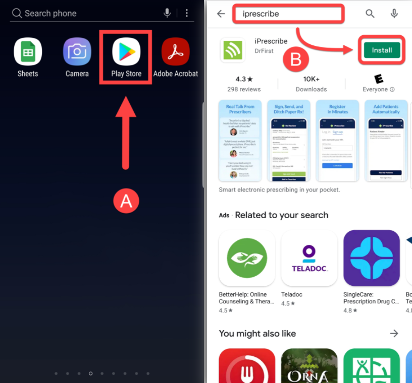 (B) Search iPrescribe in the search field at the top of your screen, then tap the Install button next to the iPrescribe app.