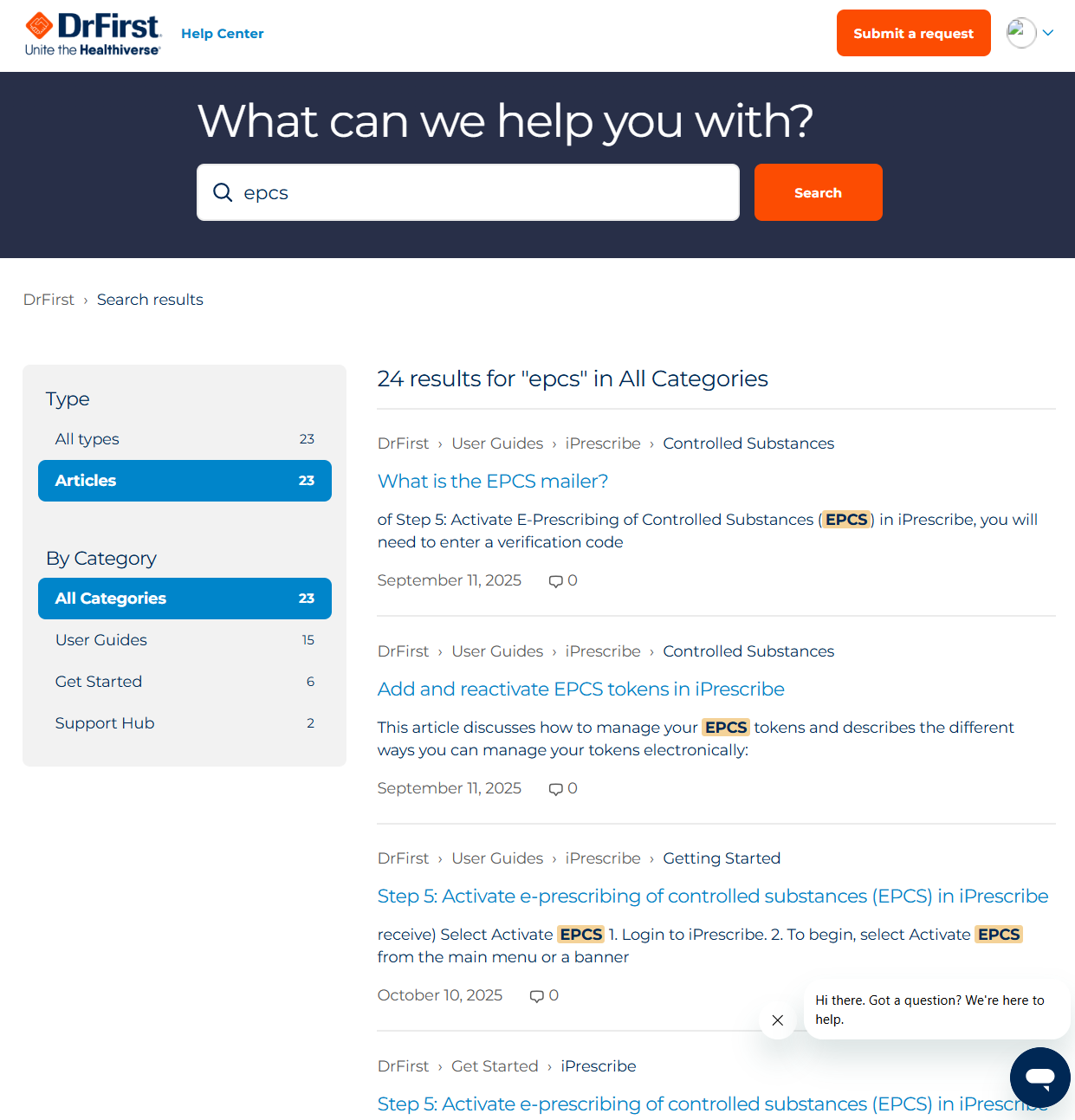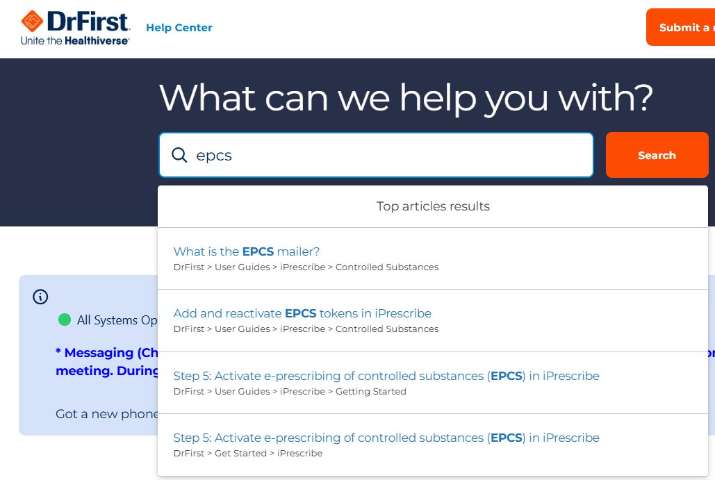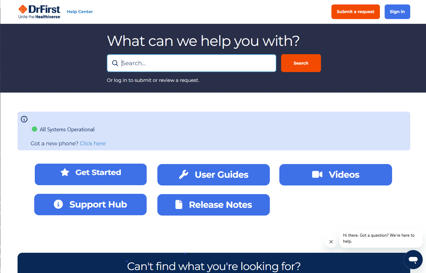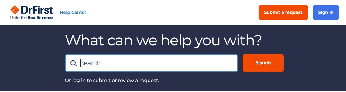 The DrFirst Help Center is your go-to place for all questions DrFirst related. The Help Center contains informative articles, videos, and guides covering all DrFirst services. If our Help Center content does not answer your question, or you have a work request, this is also your place to submit a ticket, or to initiate a chat with a Support Representative.