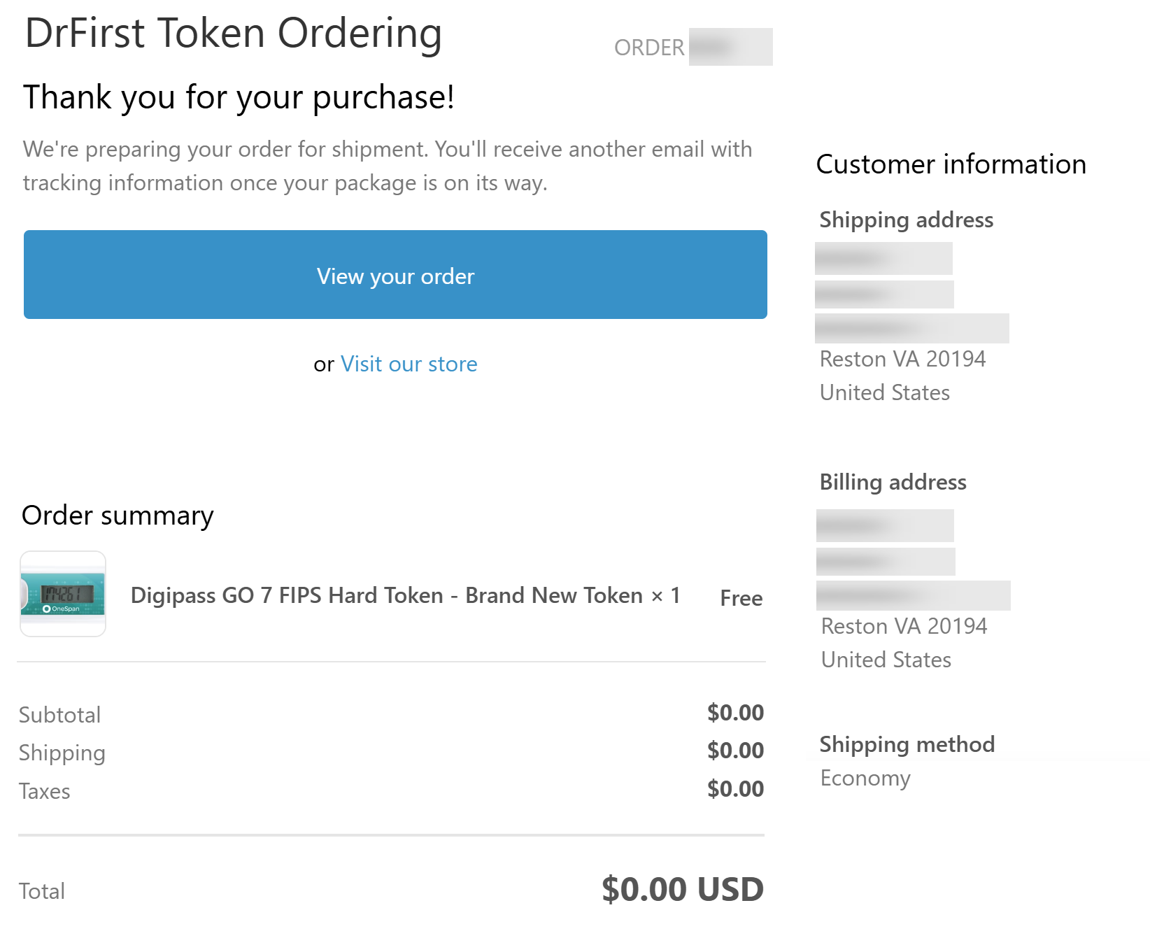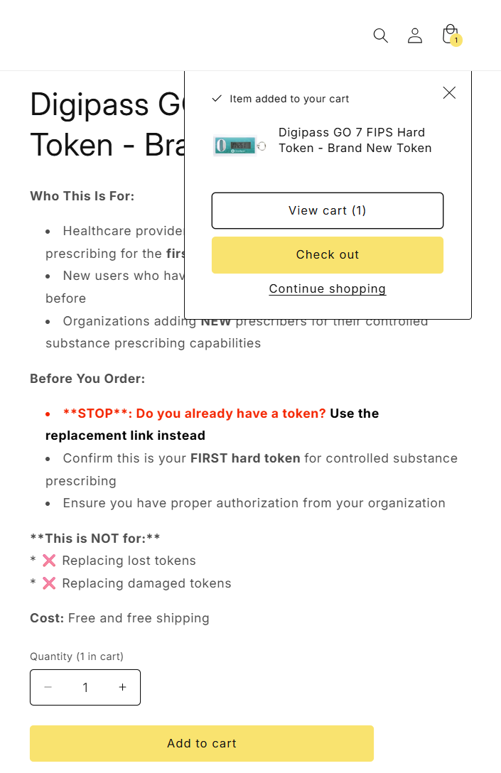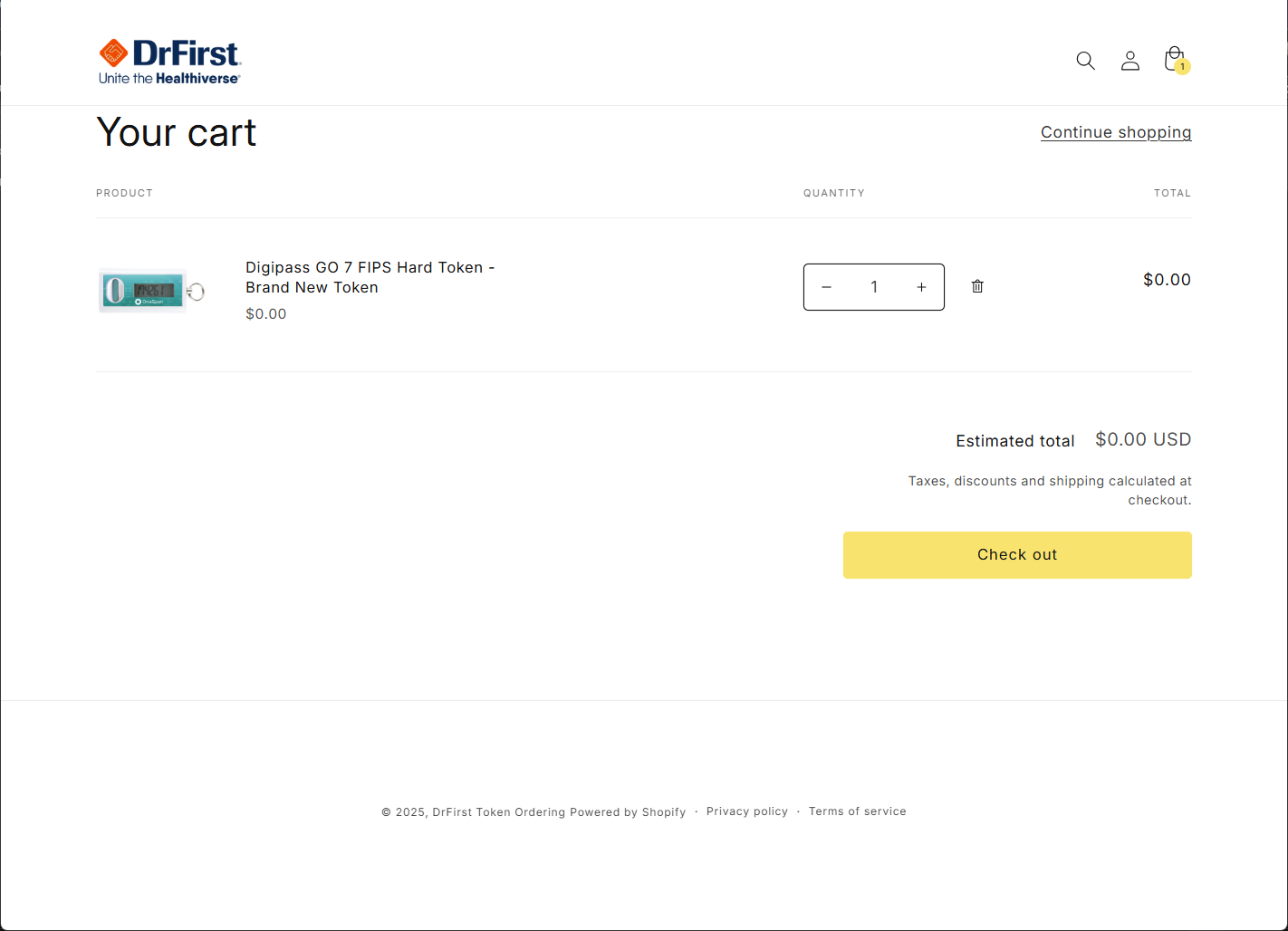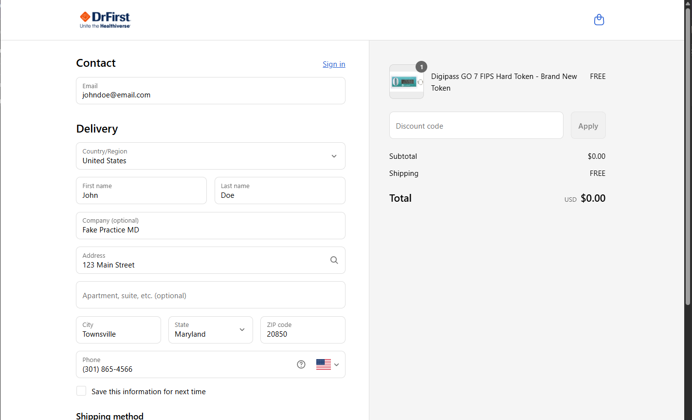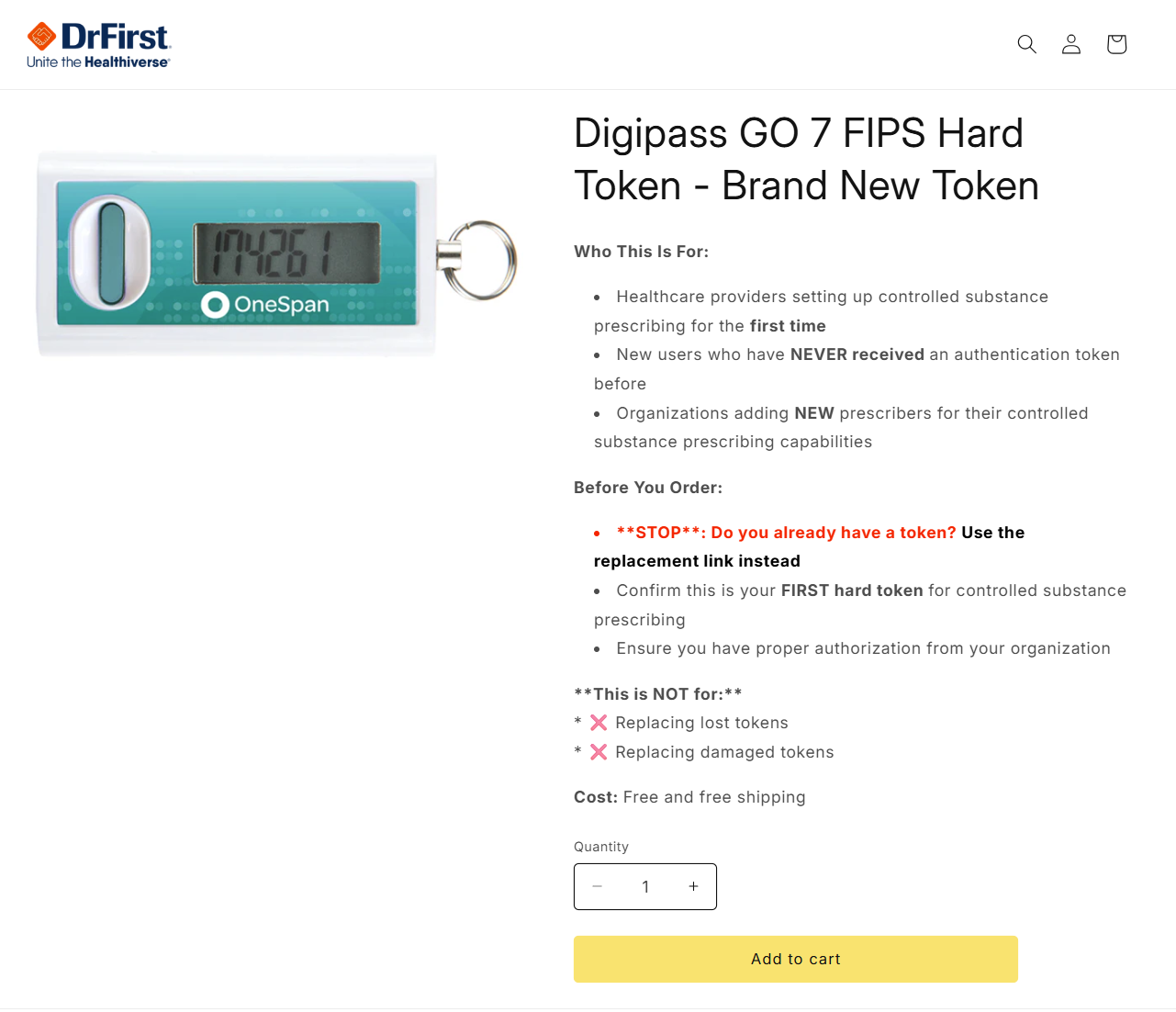 1. Navigate to the DrFirst Hard Token Request storefront to order a new hard token.