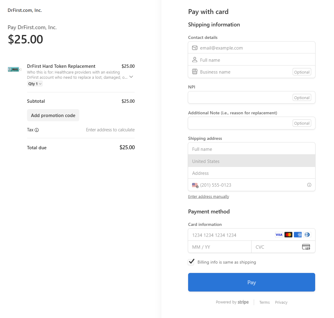 1. Contact your Customer Success Manager (CSM) or open a ticket with DrFirst Support to request a replacement token link. Access the link and select a quantity, then enter contact information.