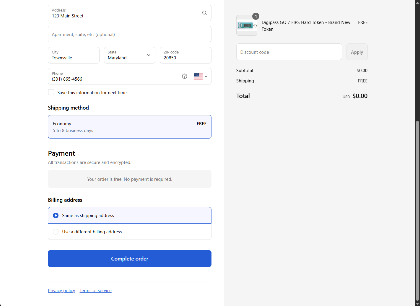 5. Once all fields are complete and checked for accuracy, click Complete order to finalize your token order.