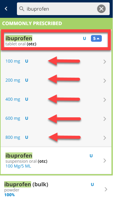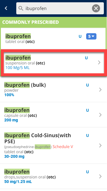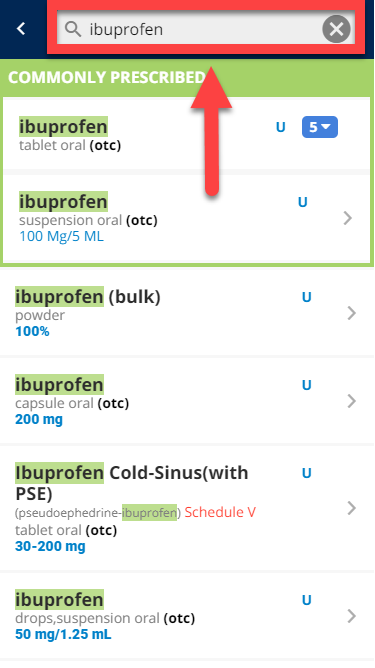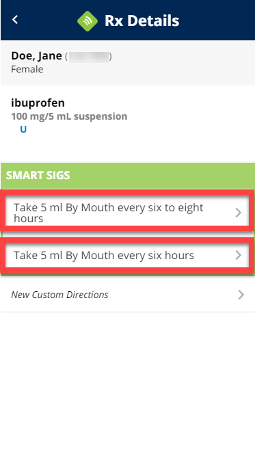 (E) If you would like to prescribe the medication with the details, dosage, and directions already pre-populated (via Smart Sigs), tap directly on the medication that already has the dosage information underneath. Continue to Step 5 (With Smart Sigs).