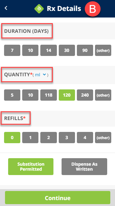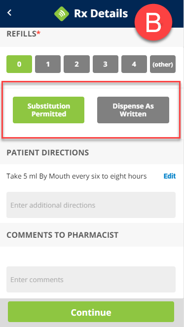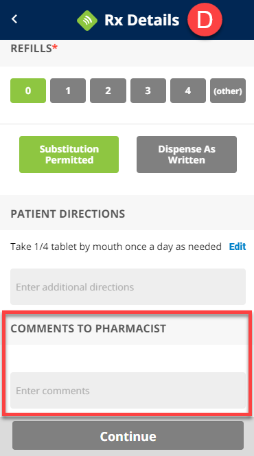 (D) Enter optional comments to the pharmacists, then tap Continue.