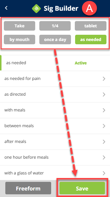 (A) Fill out the following prescription details, then click Save.