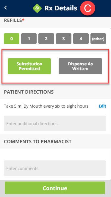 (C) Enter optional comments to the pharmacists, then tap Continue.