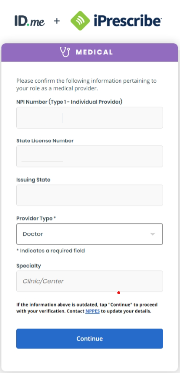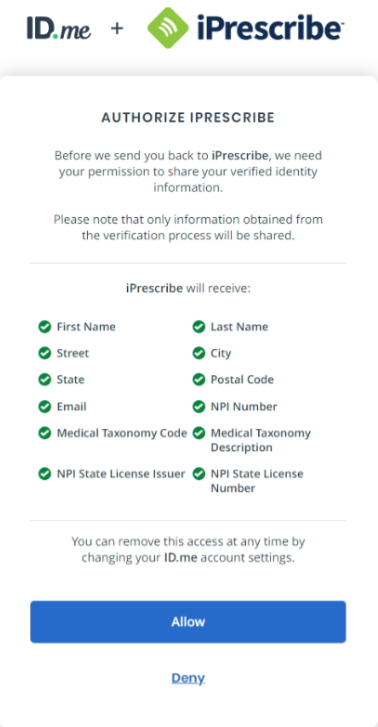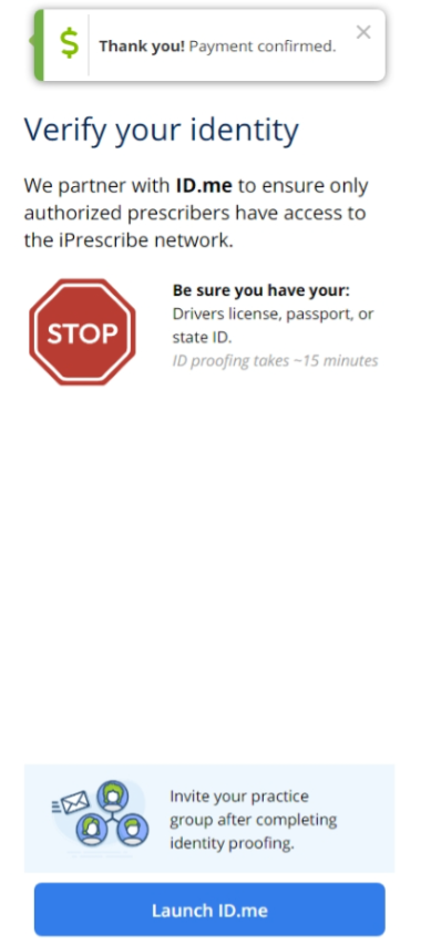 Whether you registered for iPrescribe as a single provider or you registered your practice, you will need to complete identity proofing (verification) via ID.me before you can prescribe.