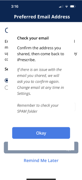 Once you enter your preferred email address, check your email to confirm the address you shared, then come back to iPrescribe.