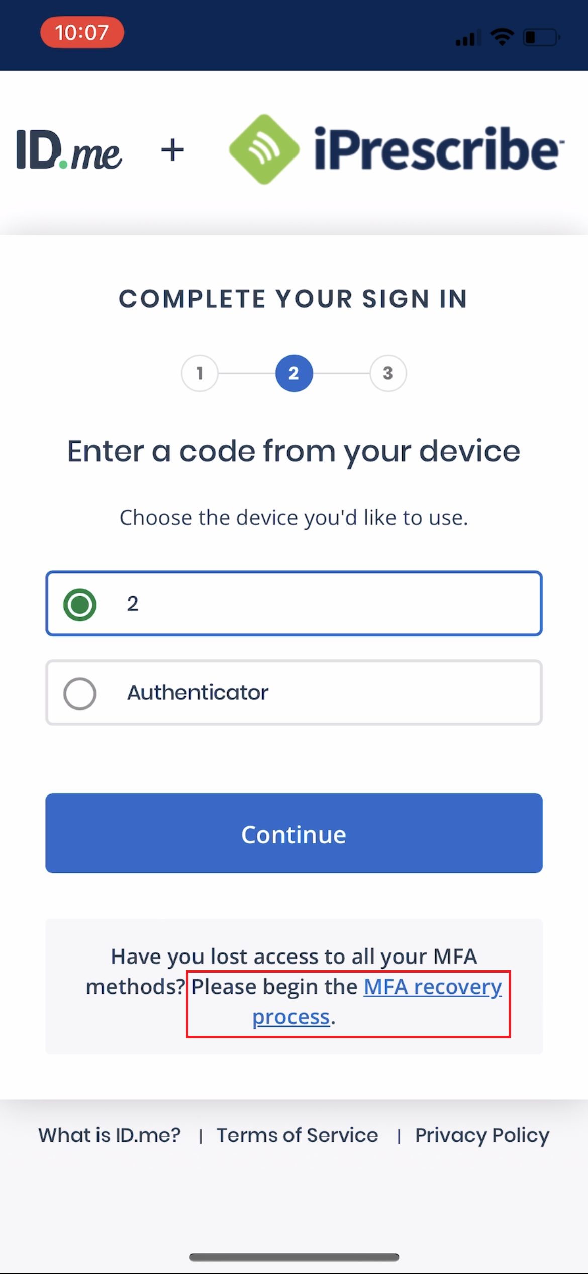 11. Enter your iPrescribe password, select your new ID.me Authenticator app from the drop-down menu, and enter the one-time passcode from the ID.me Authenticator app.